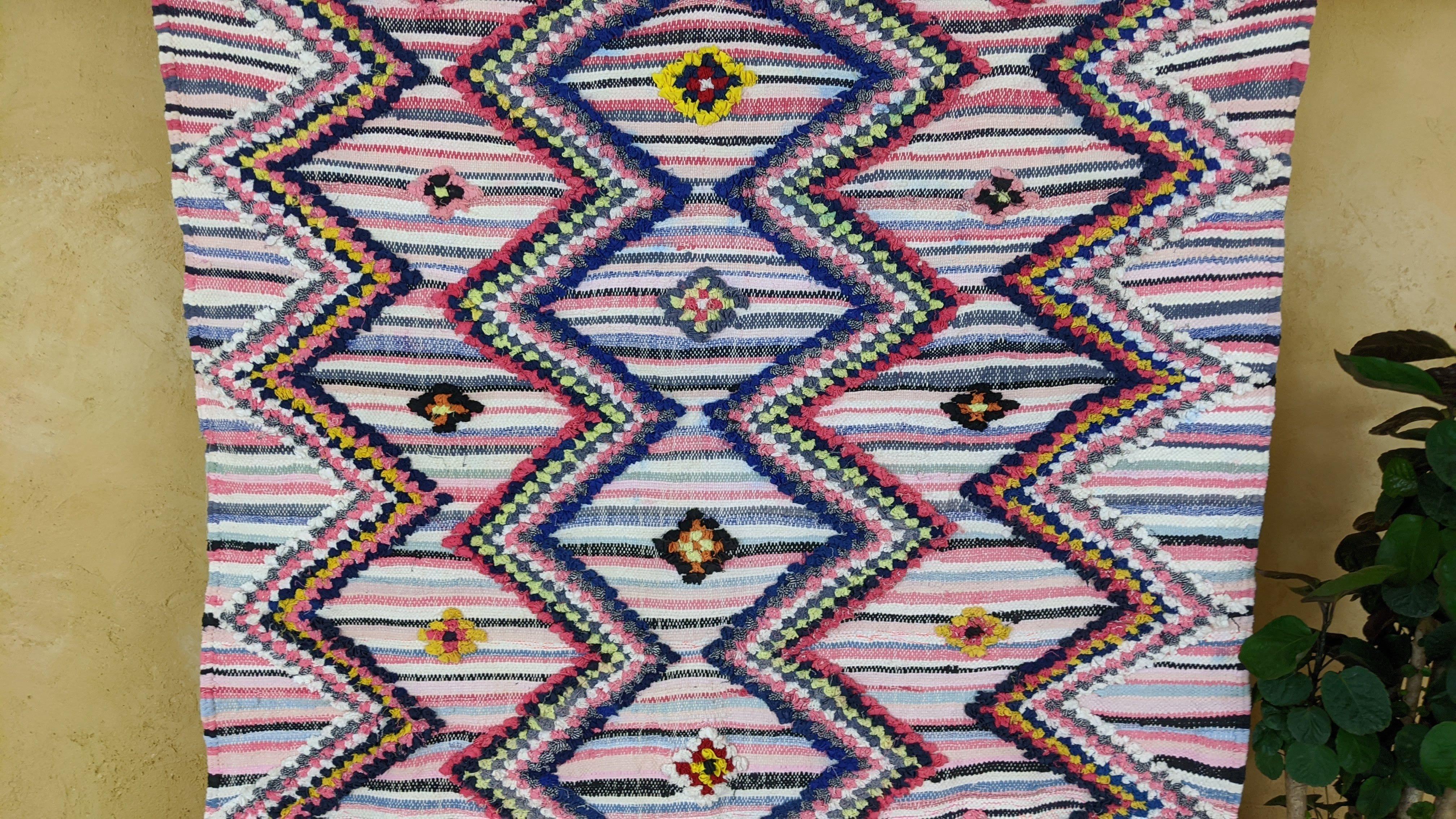 Boucherouite rugs first emerged around the 1950's, woven from pre-used clothing or scrap materials hence the name, and were used as blankets and wraps to keep warm especially during the harsh winter that the Atlas Mountains bring. These rugs are traditionally made from a mixture of thousands of scraps of used materials such as nylon, cotton and often wool. The stunning mixture of materials adds to the unique texture and design of these colorful pieces of modern art. Since the 90’s these rugs have become popular and can add character to any home.