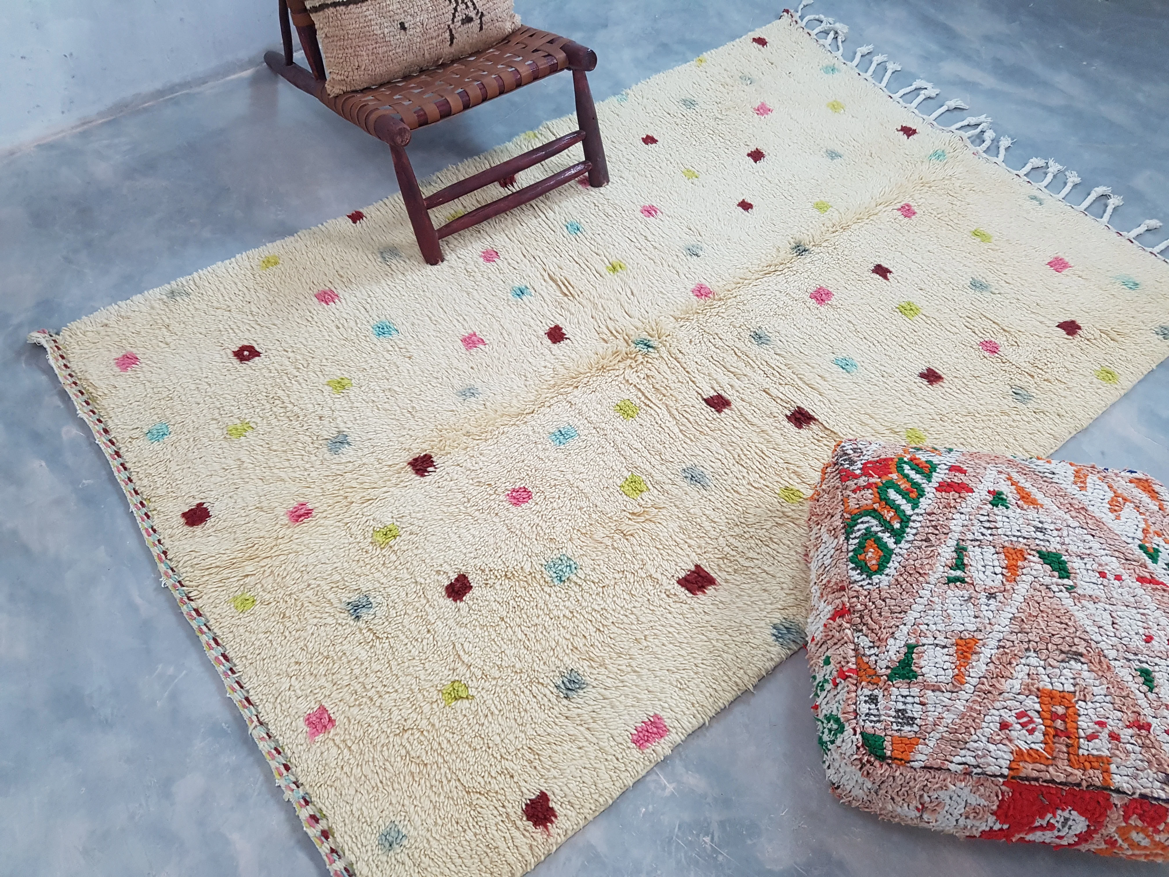 Exquisite Moroccan Berber rug, originating from the renowned Azilal region. Skillfully handcrafted by the talented women artisans of our familial cooperative nestled in the Atlas Mountains of Morocco, this rug stands as a testament to centuries-old weaving traditions. Utilizing only the softest and most organic sheep wool, each strand is meticulously woven to create a masterpiece of comfort and style. The vibrant hues that adorn the rug are derived from natural pigments, ensuring that every piece is not only stunning but also eco-friendly. Embrace the authentic Berber craftsmanship and add a touch of Moroccan elegance to your space with this unique and timeless rug.