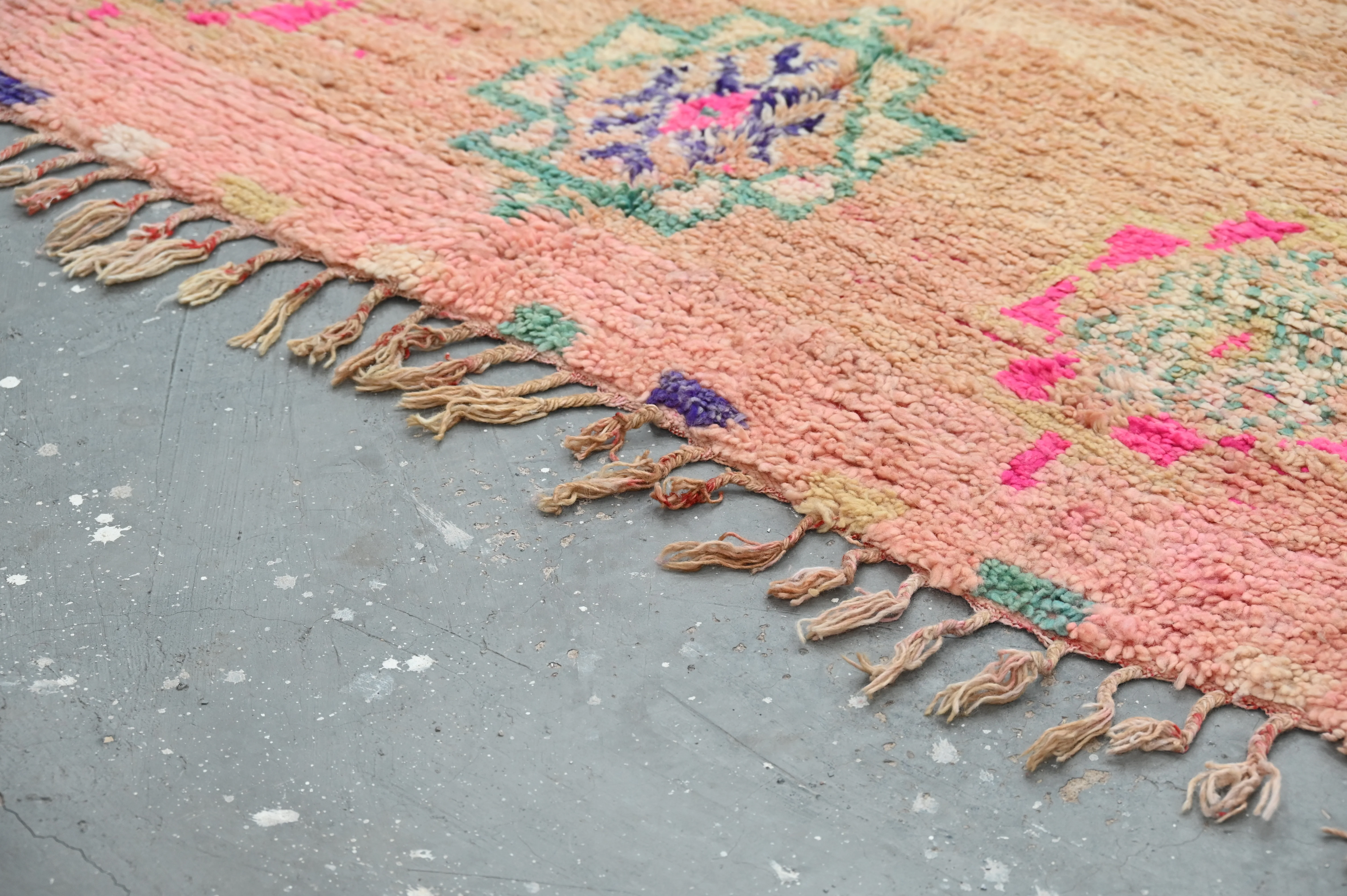 This one-of-a-kind Boujaad rug was handwoven in the mid-Atlas region of Morocco in the 1970s by skilled Berber women, using hand-spun wool and traditional weaving techniques passed down through generations.